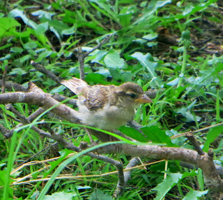 I've seen only one young house sparrow. I don't see any of them very often in my yard. There has been a female visiting the cat food bowls regularly, but the young one only very recently showed up. It is very tiny and fluffy with a bright yellow beak. It hasn't tried the cat food yet. Below is a photo of it.