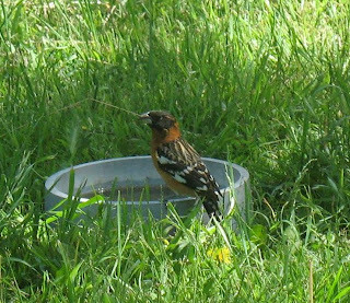The most exciting bird this past week was a black-headed grosbeak. They are usually here much earlier in the summer or in spring and only stay for a few days. We thought they had passed us by this year, but not long ago I saw a female, and today I saw probably the same one again. Black-headed grosbeaks are found in the western United States and southern Canada in the summer and Mexico south in the winter. Grosbeaks are related to cardinals and have a similar body and beak shape. Females are streaked on their faces, backs, and sometimes sides and chests. Both males and females are orange below. Males have black heads and black and white wings. They have large beaks and bright yellow under their wings. Below are two photos. The first is of the female I saw today. The second is a photo I took over a year ago of a male.