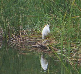 Below is another photo showing how calm and still the lagoon was. There is a very tiny white dot on the edge of the reeds toward the right. It's the great egret.