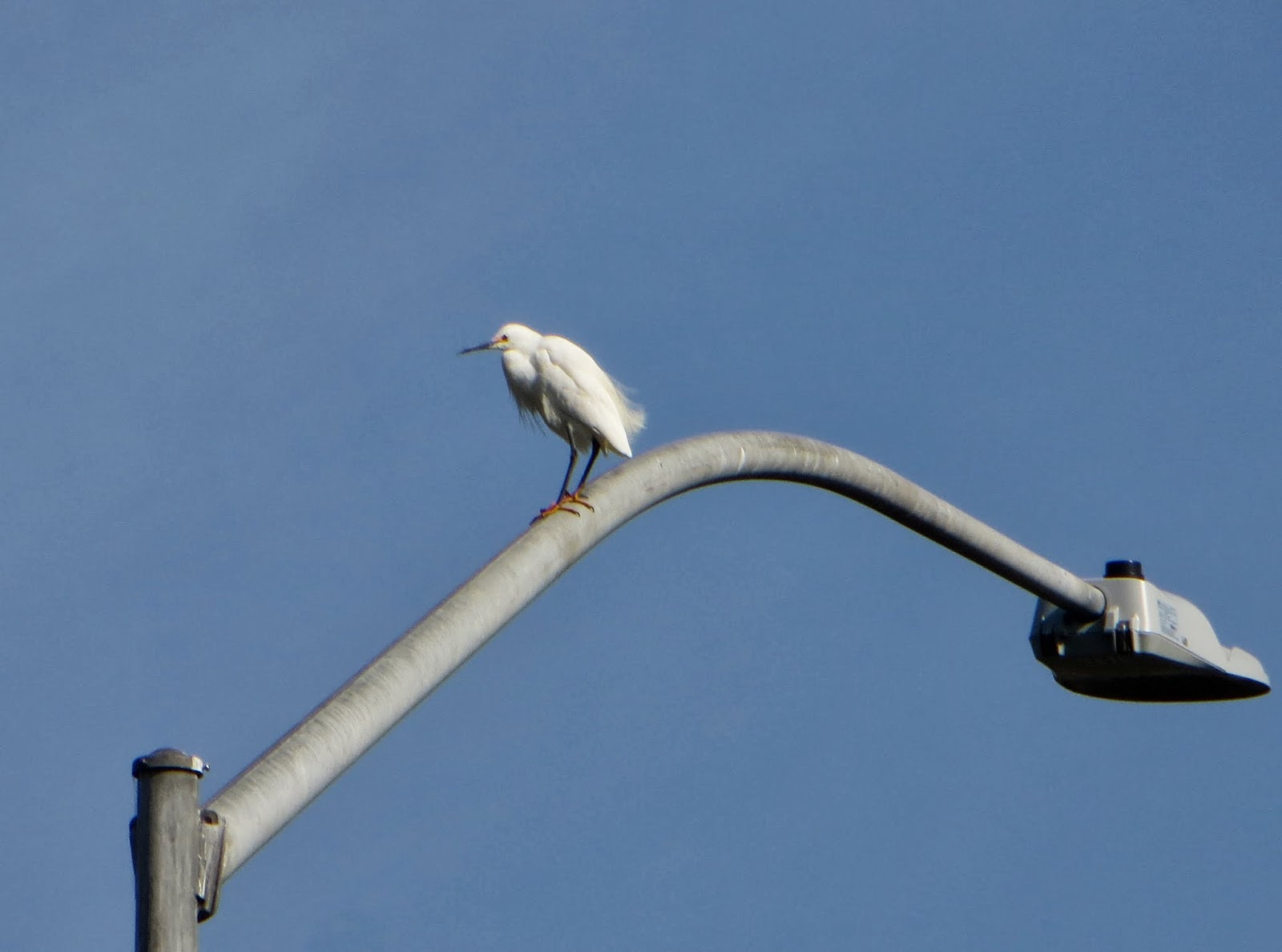 There were a couple snowy egrets around.  One was sitting on a streetlight above the freeway, then flew down into a ditch to fish.  Below are two photos of it on the light and in the ditch.
