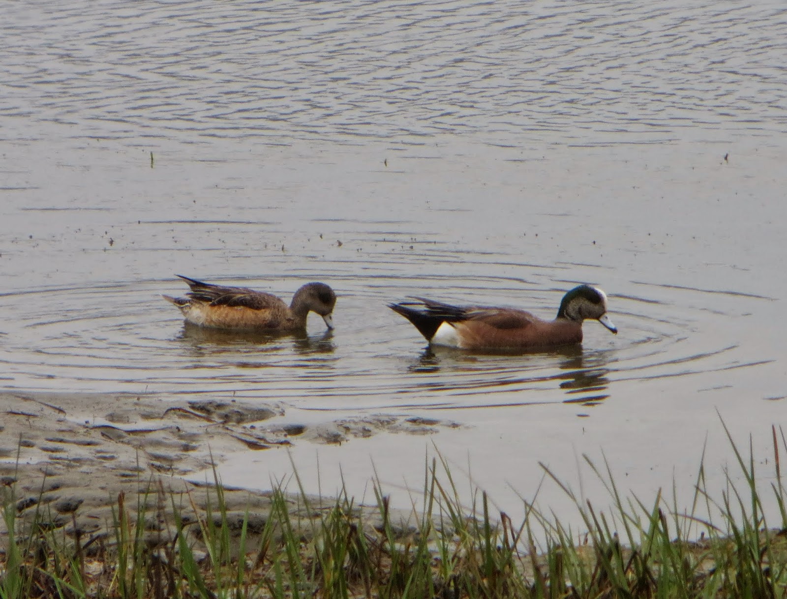 There were many, many American wigeon on the lagoon. The American wigeon is found in Alaska, Canada, and the northern United States in the summer, and southern United States, and Mexico, and northern South America in the winter. Males are reddish-brown above and white below with black tails. They have white wing patches, dark green eye patches, and white foreheads. Females have brown tails and unmarked brown heads. They are very common on ponds, and will also graze in fields. Below is a photo of a male (right) and a female (left). The white forehead is probably the most distinctive feature; there are no other common ducks in the United States with white foreheads.
