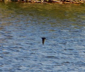 There were many, many swallows and swifts today.  There were tree, cliff, barn, and northern rough-winged swallows and white-throated and Vaux's swifts.  All together, there were over a thousand swallows and swifts.  Below are photos of three of them.  The first is a barn swallow skimming the water (notice its long pointed wings and longer tail).  The second is a cliff swallow.  The third is a swift.  I'm not positive what species, but I think it's probably a white-throated swift.