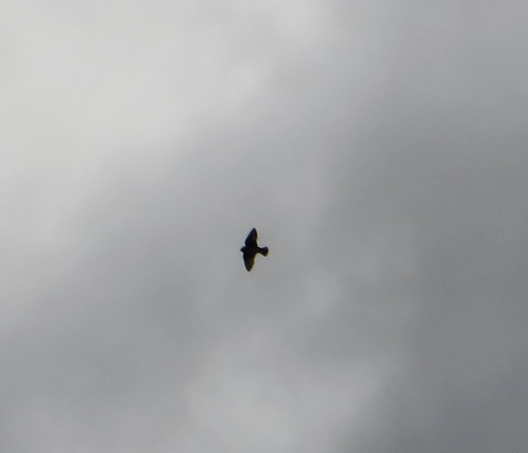 There weren't very many raptors today because of the wind.  There were only red-tailed and red-shouldered hawks.  Below is a red-tailed hawk being chased by two American crows.