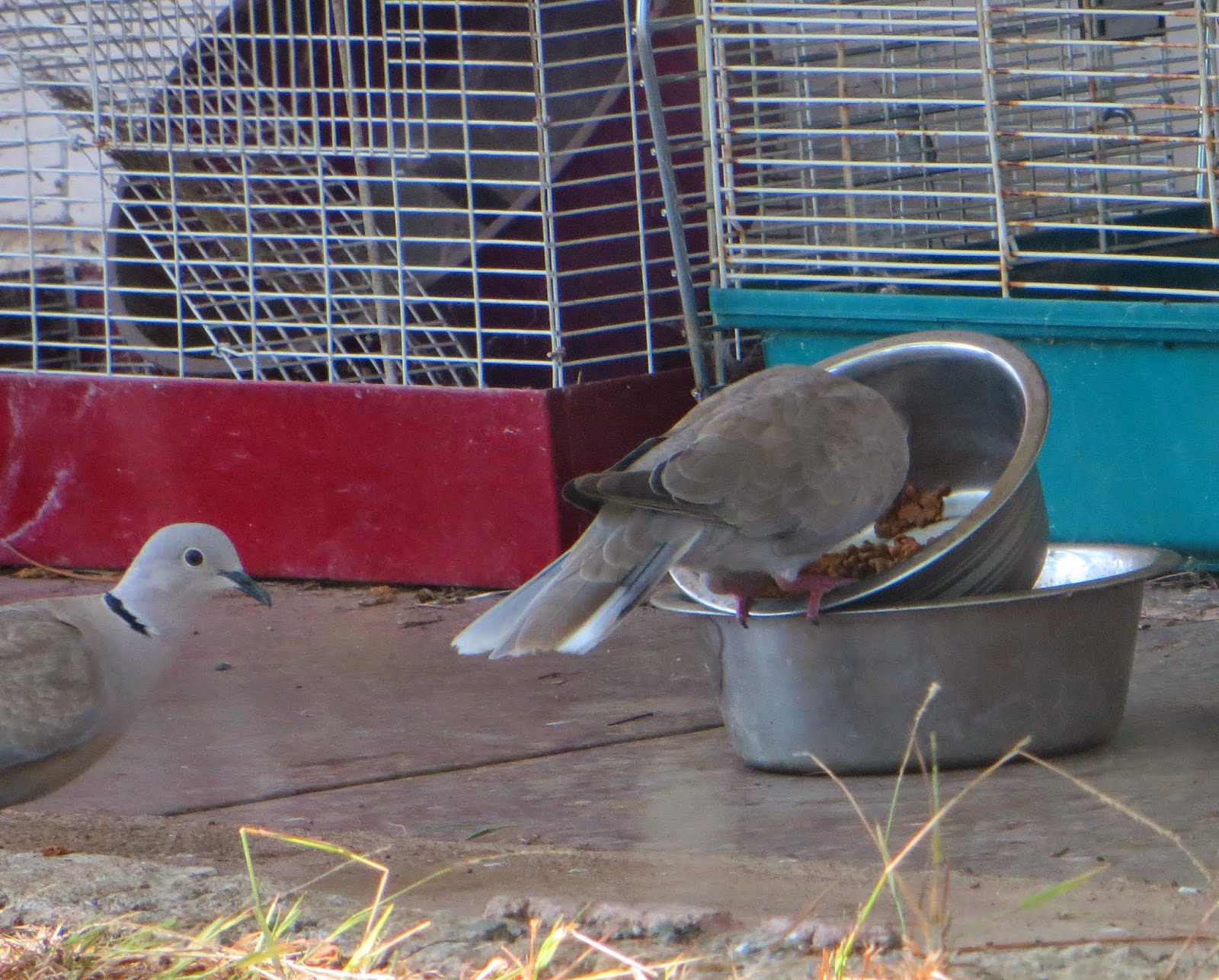 The Eurasian collared-doves still visit the catfood. They've figured out how to balance and keep the bowl from rolling and swinging around. They often come in a pair. Below are two photos of the two doves at the food bowls.