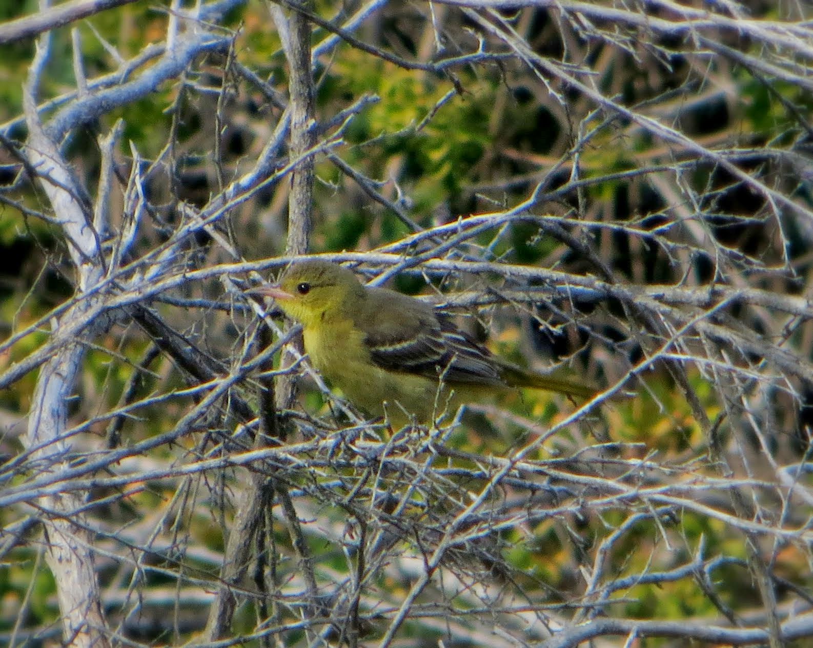 Every once in a while I'll see or hear a hooded oriole. Their song is strange and warbling, and sometimes sounds like a mockingbird. Hooded orioles will sometimes mimic other birds, similar to mockingbirds. Below is a young hooded oriole (notice the pale edges on the beak).