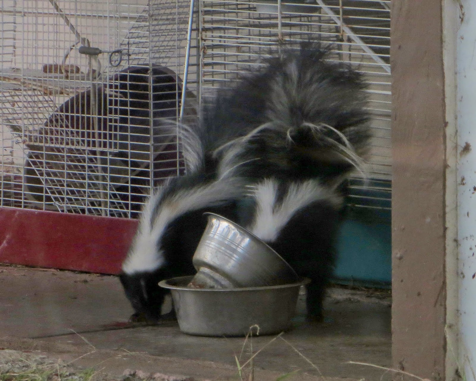 The striped skunks still visit the catfood bowls every day. The mother skunk doesn't visit very often, but the two young ones always come. We always know when they're around because they make a loud clatter with bowls when they eat. We think they might be living in a concrete tube in our yard. Below are three photos of the skunks.