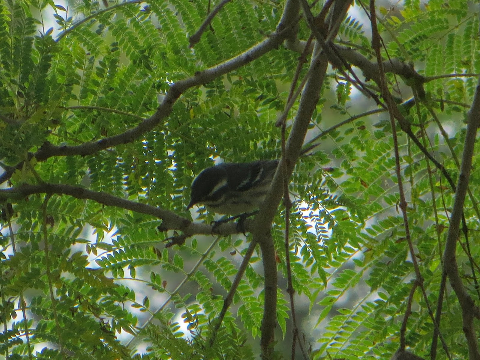 As I mentioned in my last post, a few winter birds have arrived very, very early. On Saturday, I spotted another new migrant in my yard, the Black-throated Gray Warbler. I've never seen them in my yard before, and I haven't seen them anywhere this early before. Like most of the birds in my yard, it came down to take a drink, though it didn't stay long. A couple of Mountain Chickadees also came by, though they didn't stay long enough for a photo. Although the chickadees don't migrate, I don't usually see them except in the winter. I'm still not sure why these birds have come here so early. Below are two photos of the Black-throated Gray Warbler in the jacaranda tree.