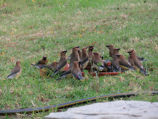 Bonus: A large group of Cedar Waxwings came down to take baths and drink in my yard yesterday. They were all crowding each other and being very noisy, all trying to bathe and drink at the same time out of one small clay bowl. More birds were constantly joining or flying off. It was very chaotic. Below are two photos of some of the waxwings.