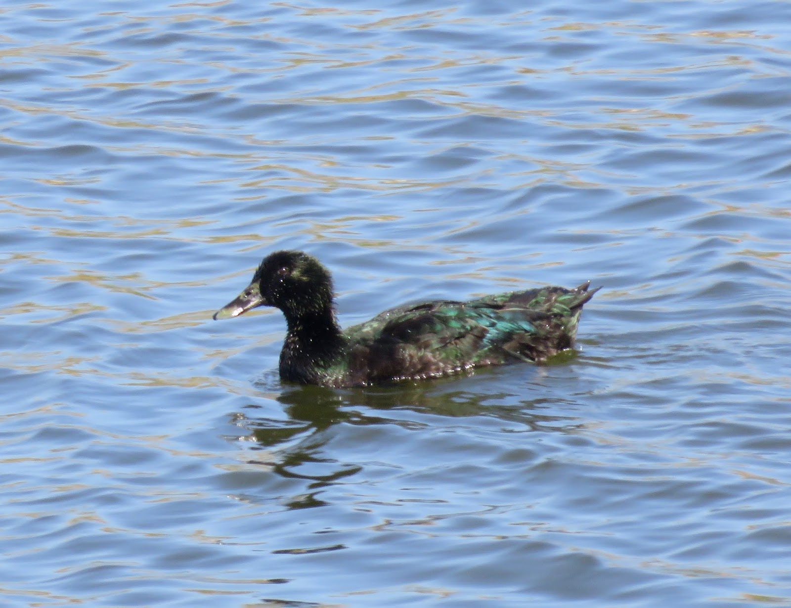 That black domestic Mallard that appeared a couple months ago is still here, and it's not actually all black. The past couple months were cloudy, so we only saw that the duck was very dark. It actually has green iridescent feathers all over its body, and is very beautiful. It was hanging out with some wild Mallards. Below are two photos of the domestic Mallard (plus a wild Mallard).