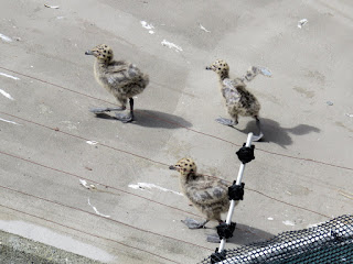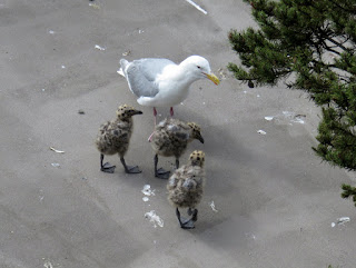 The mammal and bird exhibits were open air exhibits and had a great view of Elliot Bay. We climbed some stairs to a platform that overlooked the top of the Tufted Puffin exhibit. In the shade of the trees were three sleeping gull chicks. Their mother was a little way off and began calling to them with a very soft sound. They woke up and ran over to her, then started wandering around and flapping their fuzzy wings. They were very cute. Since I didn't have my field guide with me, I had to look them up later, and it turns out they were Glaucous-winged Gulls, which I'd never seen before. Glaucous-winged Gulls are found in northern Alaska in the summer and along the Pacific Coast from Oregon to the tip of Baja California in the winter. They are found all year from just above the Aleutian Islands down to Washington. Glaucous-winged Gulls are large, pale gulls with dark eyes, pink legs, and gray wingtips. In the winter, they have speckled brown heads. Below are five photos. The first is of two of the chicks sleeping and the second is of the mother with the three chicks. The third and fourth are of the chicks by themselves, and the fifth is of the mother.