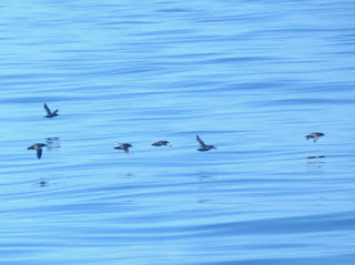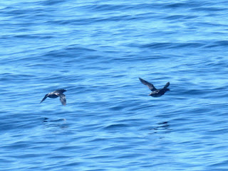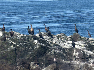 There were also numerous cormorants on the island. There were Double-crested, Brandt's, and Pelagic Cormorants there, just sitting around. In the photos below, there are only Brandt's and Pelagic. Pelagic Cormorants are found in northern Alaska in the summer and northern Baja California in the winter. Along the coast from the Aleutian Islands down to California, they are around all year. They are smaller than Brandt's and Double-crested Cormorants and are entirely dark-colored except for white patches on their flanks during breeding season. They have slender necks, thin bills, and long tails. As their name suggests, they are found on the open ocean. Below are two photos. They are the same photo, but the second is zoomed in to better show a Pelagic Cormorant, which is the smaller one in the back right. In the first photo, besides the cormorants, there is a Black Oystercatcher and a Heermann's Gull in the middle at the bottom.