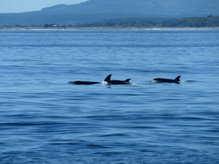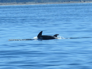 Where the Orcas had been sighted, there were a few whale-watching boats floating around. We sat and waited, then after a minute or so, a group of Orcas came to the surface. At first, a male Orca (tall, straight dorsal fin) was the main focus of attention. Then, a small group that included a female (shorter, curved dorsal fin) and her baby came and swam fairly close by. The Orcas were very impressive, and everyone on the boat was able to get very good views of them. However, since we still had to stay on schedule, we had to leave the Orcas after a while. Below are five photos. The first is of the male Orca. The rest of the photos are of the small group with the mother and baby (in all of them, the mother is in front with the tallest dorsal fin - she was identified by a small chip out of the middle of her fin - and the baby is the small one in the middle with the shortest dorsal fin).