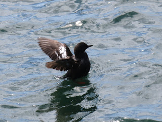 On the water near the pier were a couple of Pigeon Guillemots. One was very close to us (almost right below). It was preening itself, then vigorously flapping its wings. It was very small (pigeon-sized) and in nice breeding plumage, and I was able to take a few good photos of it. Below are three photos of the guillemot.