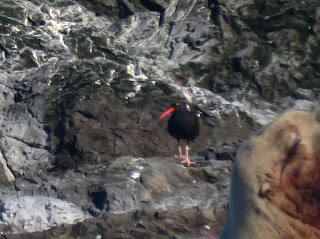 There were other wildlife on the island, too, besides the sea lion. As I was looking at the island, I saw small dark shapes moving over it. I couldn't see them very well, so I took photos, hoping I'd catch one. I did, and discovered they were Black Oystercatchers. Black Oystercatchers are found year-round along the Pacific Coast from the Aleutian Islands down to Baja California. They are distinctive with their entirely black plumage, bright red bills, and pale legs and feet. True to their name, they catch oysters and other mollusks. There were quite a few of them running around on the island, though they blended in pretty well with the dark rocks. Below is a photo of one of them (the thing in the lower right corner is the sea lion's head).