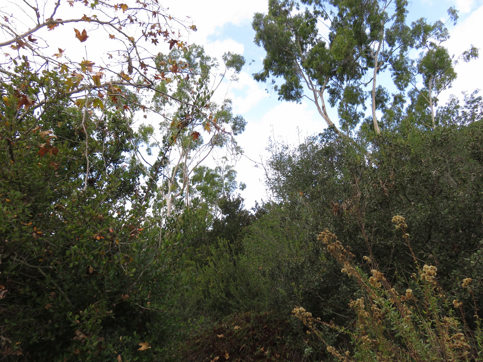 There's work being done to clear away some of the overgrown reeds at the lagoon. When I walked along the trail behind the Nature Center, there was a hole cut through the reeds, and I could see straight out into the middle of the lagoon, where a large group of California Gulls were floating. There were also some coots swimming around in the now open water between the walls of reeds. Below are four photos. The first two are of the areas where reeds were cut away, the third is of the California Gulls, and the fourth is of one of the coots.