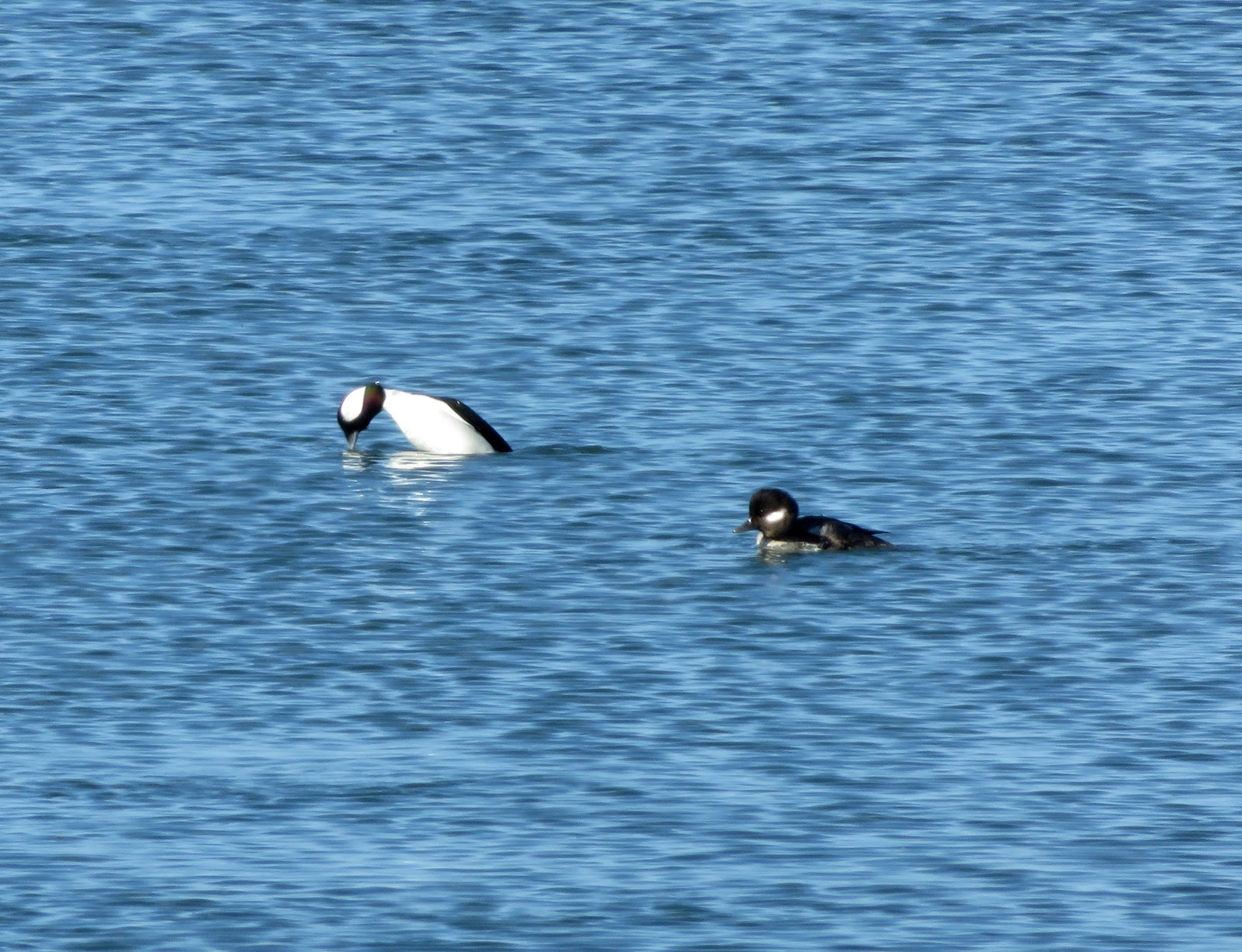 There were Bufflehead in the harbor, too, though most of them were a bit far away. They were all diving into the water over and over and over. Below is a photo of two of them, a male and a female (the male is diving).