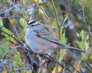 I got my first good photograph of a white-crowned sparrow. The birds just don't seem to ever hold still! I was very lucky to get this photo below. They are very common, but very nice-looking sparrows. They summer in the northern United States and Canada, and winter down in the middle and southern United States (like my area) and Mexico. They have a very nice song, and sing very often. The one below was singing.