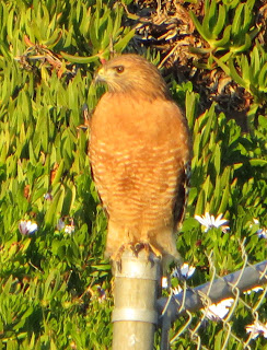 On the same walk that I saw the merlin, I saw a red-shouldered hawk sitting down low on a metal fence, a very unusual spot for that kind of large hawk. They're very beautiful hawks with bright reddish heads and bodies and black and white wings and tails with red shoulders. They eat nearly everything; reptiles, amphibians, small mammals, and birds are all on their menu. They're related to red-tailed hawks, both being buteos, but they're smaller. The one below didn't seem to mind people looking at it too much, because other walkers stopped to look.