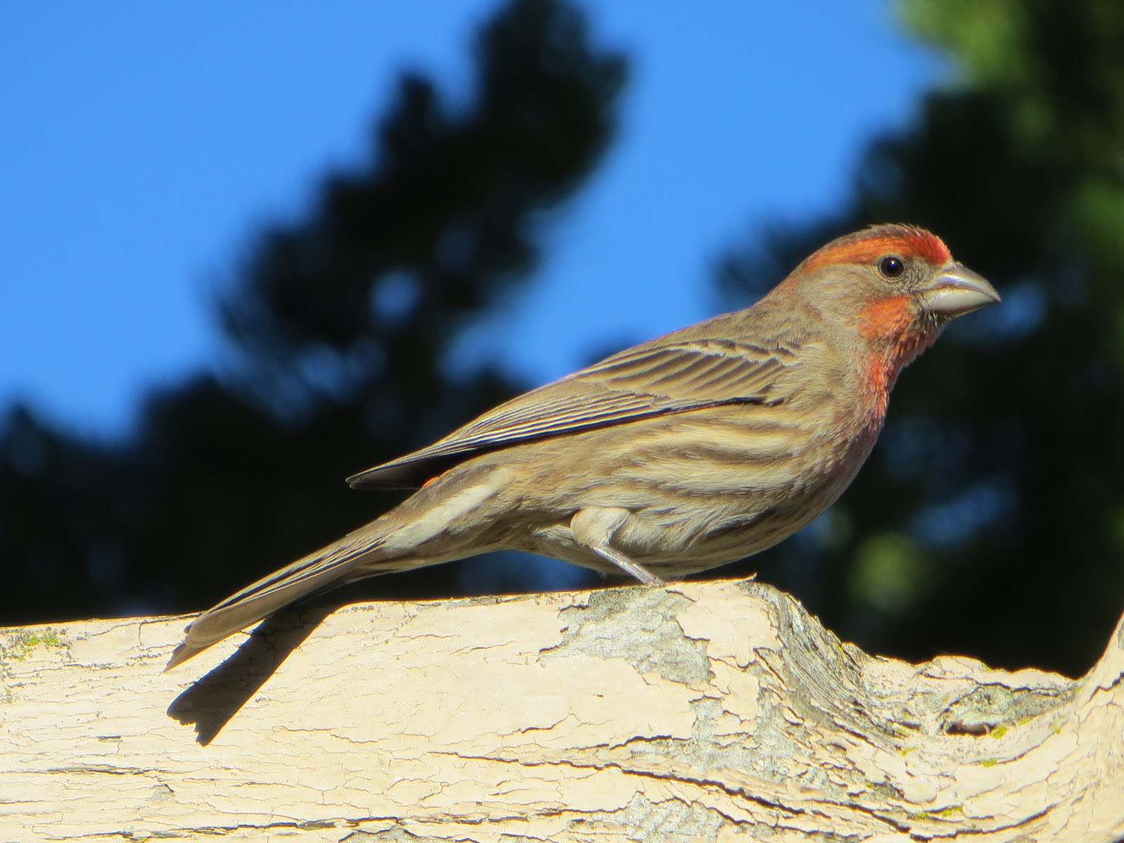This is a photo of a house finch. These birds can be found throughout the United States and are common visitors at bird feeders. This morning I saw about fifty of them in one tree. They have a very nice little song. This one in the picture had come to investigate the 'pst' noises I was making.