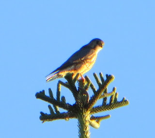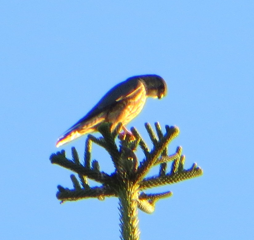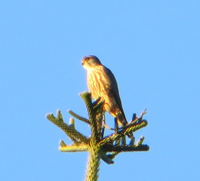I saw a merlin today in Vista, California at around 4:45 in the afternoon, just as the sun was about to go down. A merlin is an uncommon small falcon found normally in coniferous forests with open fields, where it hunts small birds and large insects. It is very uncommon here, as there isn't a forest, and there are few open spaces, so that's why it was exciting. It was in a tall conifer. Here are some photos!