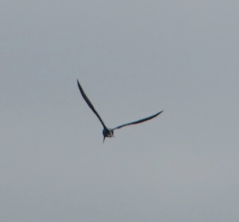 There were many terns around today as well. There were Forster's, Caspian, and least terns. Least terns are found on the coasts of the United Sates and Mexico and in some areas of the Midwest around bodies of water in the summer. They are found in northern South America in the winter. Although they are relatively common in the areas they are found in, they are considered endangered because their preferred habitat and nesting areas are also favorable areas for recreation. They are particularly vulnerable because their nests are often just eggs on sand or gravel on the ground without much protection. Least terns can easily be told apart from other terns by their small size, black caps with white foreheads, and yellow legs and beaks. Below is a least tern flying away.