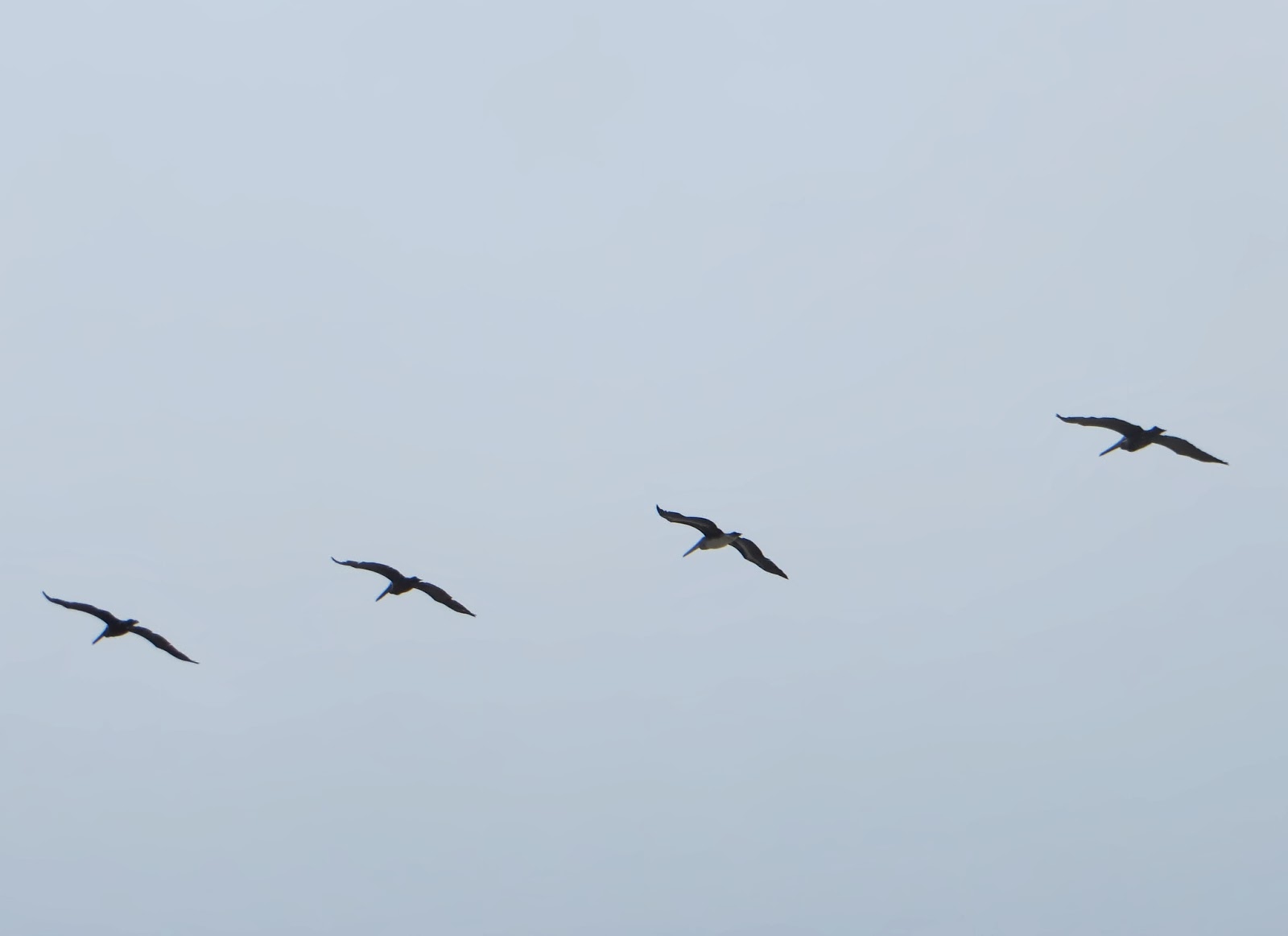There were tons of brown pelicans. At one point, there was a flock of about fifty of them flying by one a gigantic V. Below are two photos of a smaller flock of four. In the first photo, the pelican on the right is a young one. In the second photo, it is the second from the right. It is noticeably paler than the others.
