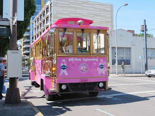 Two weeks ago on Saturday, we went on a trolley bus and took a short tour of downtown Portland. We went to a Chinese garden and saw beautiful water-lilies and koi fish. Below are three photos. The first is of the trolley-bus, the second is a water-lily, and the third is of four koi fish.