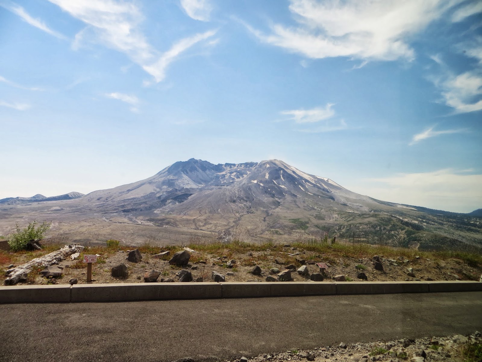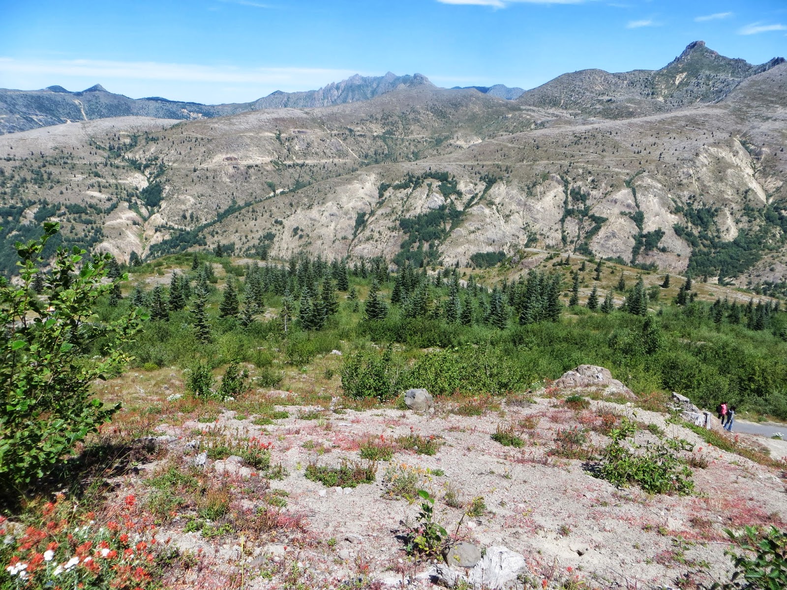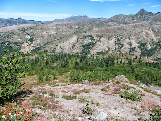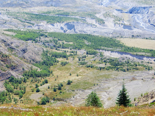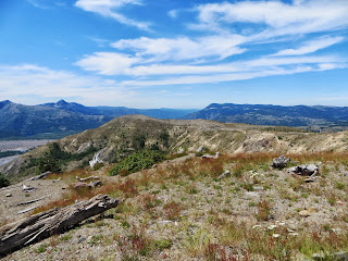Mount St. Helens is an active volcano that used to be cone-shaped until it erupted on May 18, 1980. A strong wind from the explosions, rivers of mud, and huge amounts of ash killed wildlife and people, and changed the green, forested area to a barren, rocky place. Plants returned remarkably fast, though. Hardy flowers and some other plants sprouted. Tree seeds that had survived, or ones pushed upwards by gophers (which were some of the first animals to return), sprouted. Other small animals began to return, and then birds and elk and others. It's been about thirty years since the eruption, and there are still very barren areas, but there are also many, many flowers and trees. Where we were, it was very dry and rocky and there were very few birds, but farther down, it was very green. Below are three photos I took of Mount St. Helens from different places.