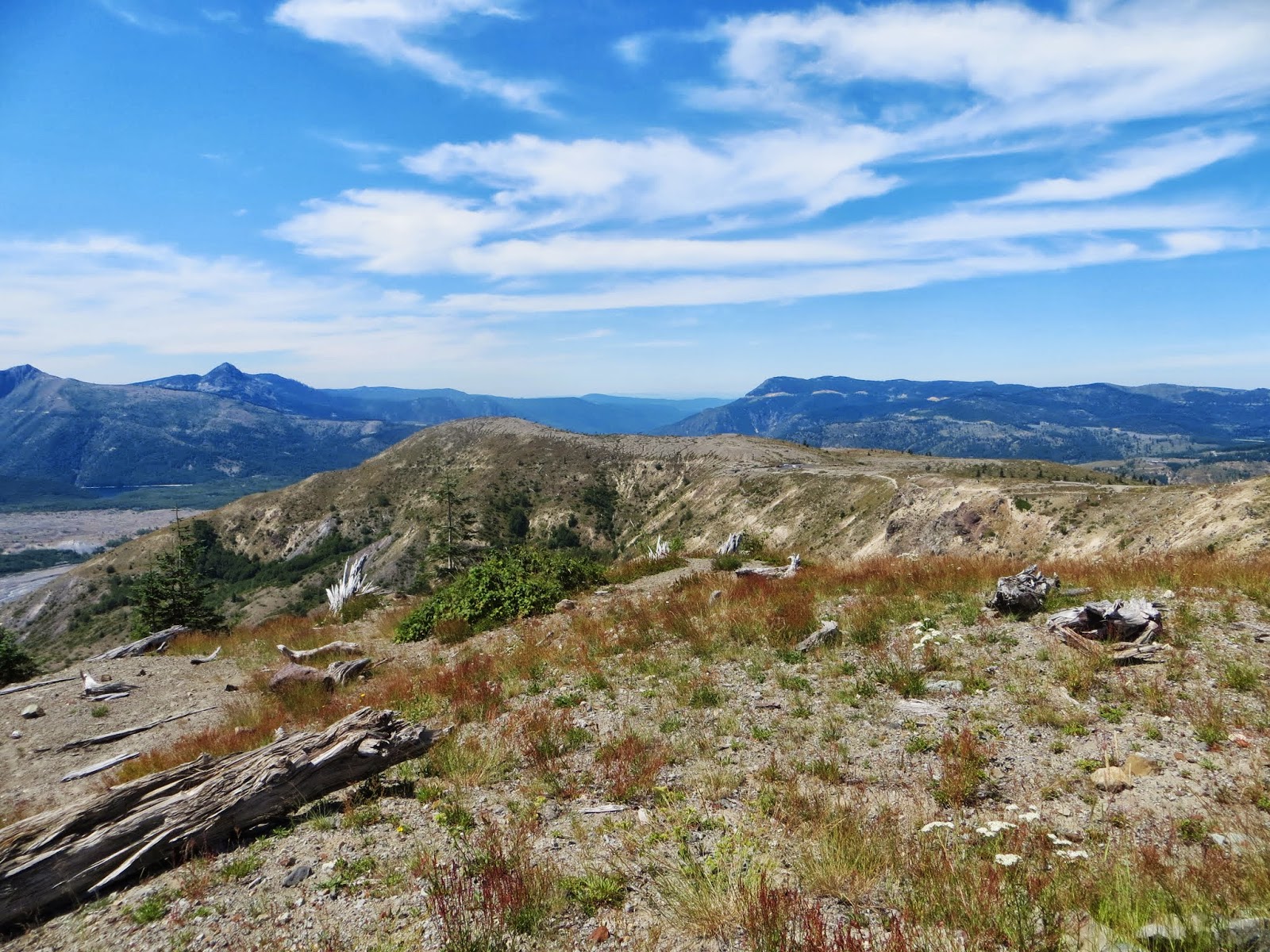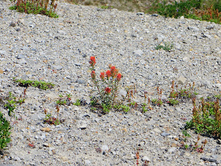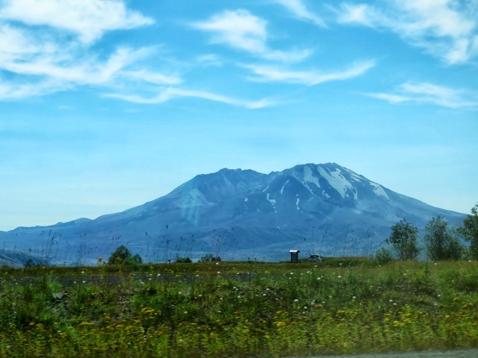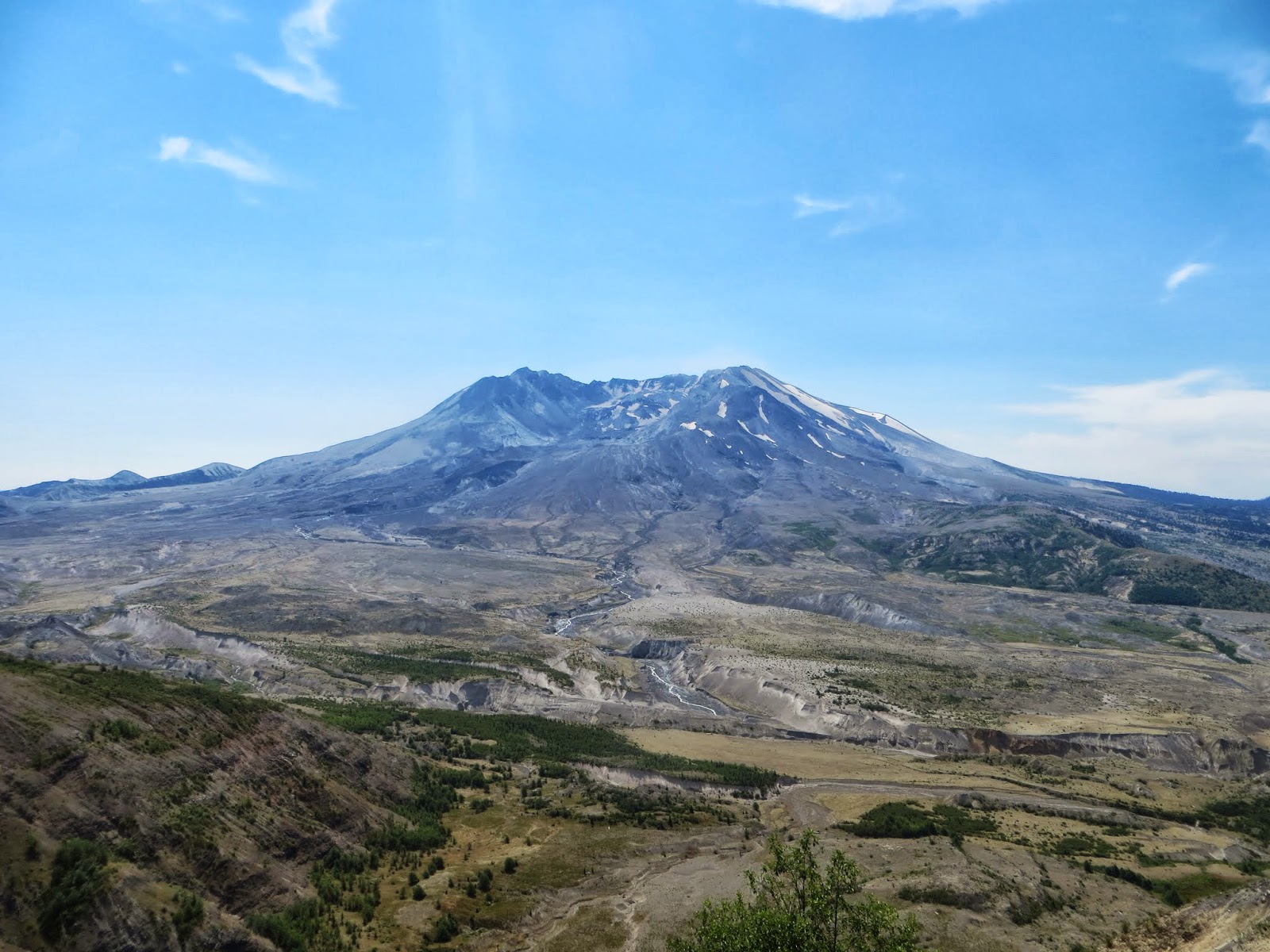 Mount St. Helens is an active volcano that used to be cone-shaped until it erupted on May 18, 1980. A strong wind from the explosions, rivers of mud, and huge amounts of ash killed wildlife and people, and changed the green, forested area to a barren, rocky place. Plants returned remarkably fast, though. Hardy flowers and some other plants sprouted. Tree seeds that had survived, or ones pushed upwards by gophers (which were some of the first animals to return), sprouted. Other small animals began to return, and then birds and elk and others. It's been about thirty years since the eruption, and there are still very barren areas, but there are also many, many flowers and trees. Where we were, it was very dry and rocky and there were very few birds, but farther down, it was very green. Below are three photos I took of Mount St. Helens from different places.