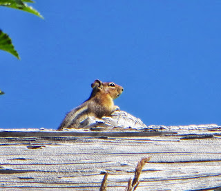 The only mammals we saw were golden-mantled ground squirrels. They are found in the western United States. They look similar to chipmunks, but have white eye-rings rather than stripes on their faces. They have reddish-brown fronts and are gray on their backs and tails. They have black and white stripes on their sides and are white below. They are very beautiful ground squirrels. Below is one of them.