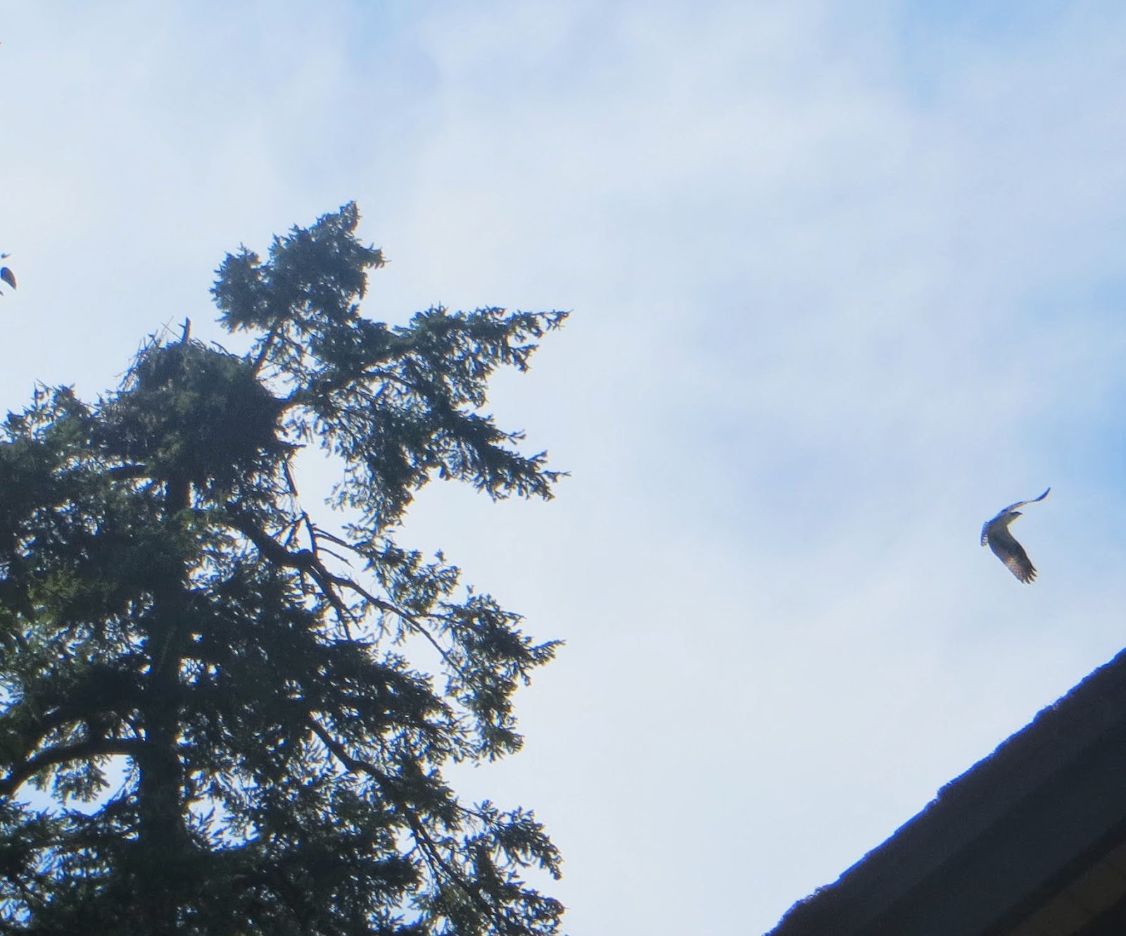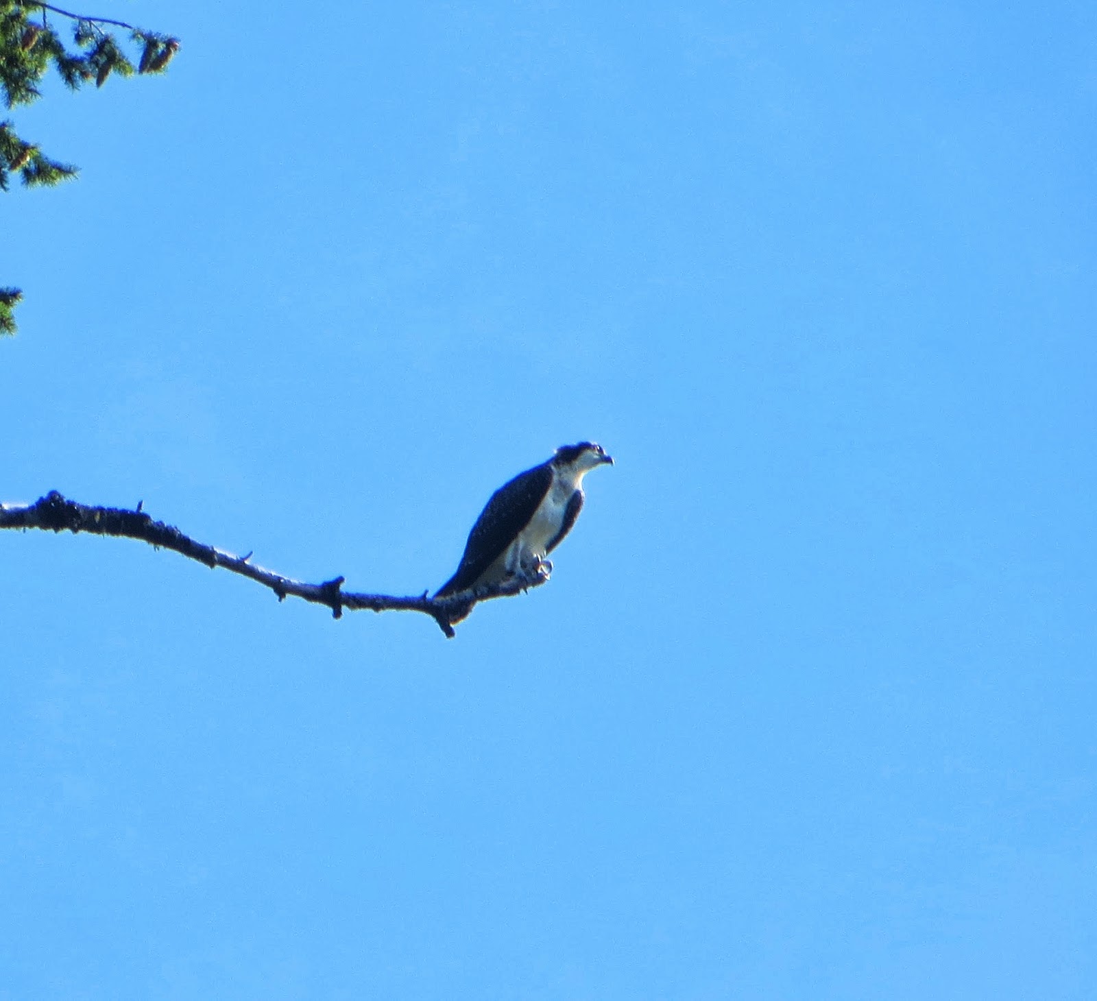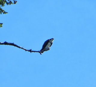 On the final day of our trip, we went to Mount St. Helens. It was quite a long, winding trip up there. The views from the road were very beautiful. It was mostly forest and a lake or two. We stopped briefly at a visitor's center, where there were three or four ospreys flying around. There was also a nest high up in a tree. Below are some photos of them. The fourth photo is of the nest (left) and an osprey that had just flown out (right).
