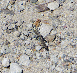 There were several different insects running and flying around. One of them was a kind of grasshopper, though I don't know the species. It was gray and blended in well with the rocks. They would frequently fly into the air and I could see that they had a bright, electric green color under their wings. When they landed it was incredibly hard to find them, even if I saw where they landed. I did manage to take a photo of one of them. Below is the photo. If I can find out what species it is, I'll put it on the Insects and Arachnids page.