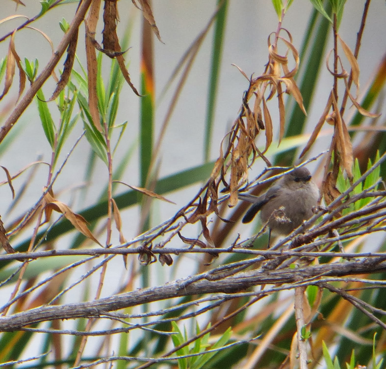 There were tons of bushtits flying around, so I just took a ton of photos of groups of them, hoping at least one of the bushtits ended up in focus. One of them did, and below is its photo. It is a male (black eyes).
