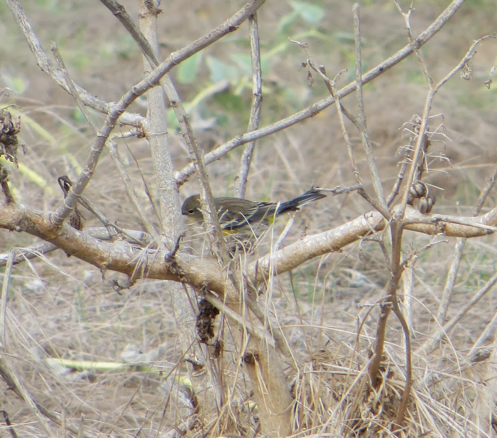 The yellow-rumped warblers have returned in large numbers. Below is one of them half hidden behind a dead plant.