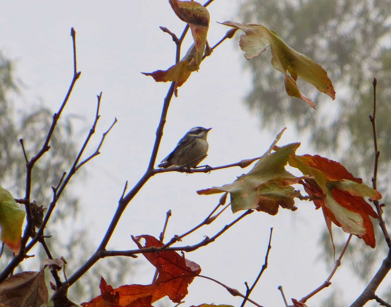 We saw a black-throated gray warbler. It was a new bird for most of us. Black-throated gray warblers are found in the western United States in the summer, and Mexico and South America in the winter. Unlike most warblers, they are entirely black, gray, and white except for two yellow dots between their eyes. They are dark gray on their backs, white below, and have black and white streaked sides and faces. They are found high up in trees in woodlands. Below are two photos of the black-throated gray warbler.