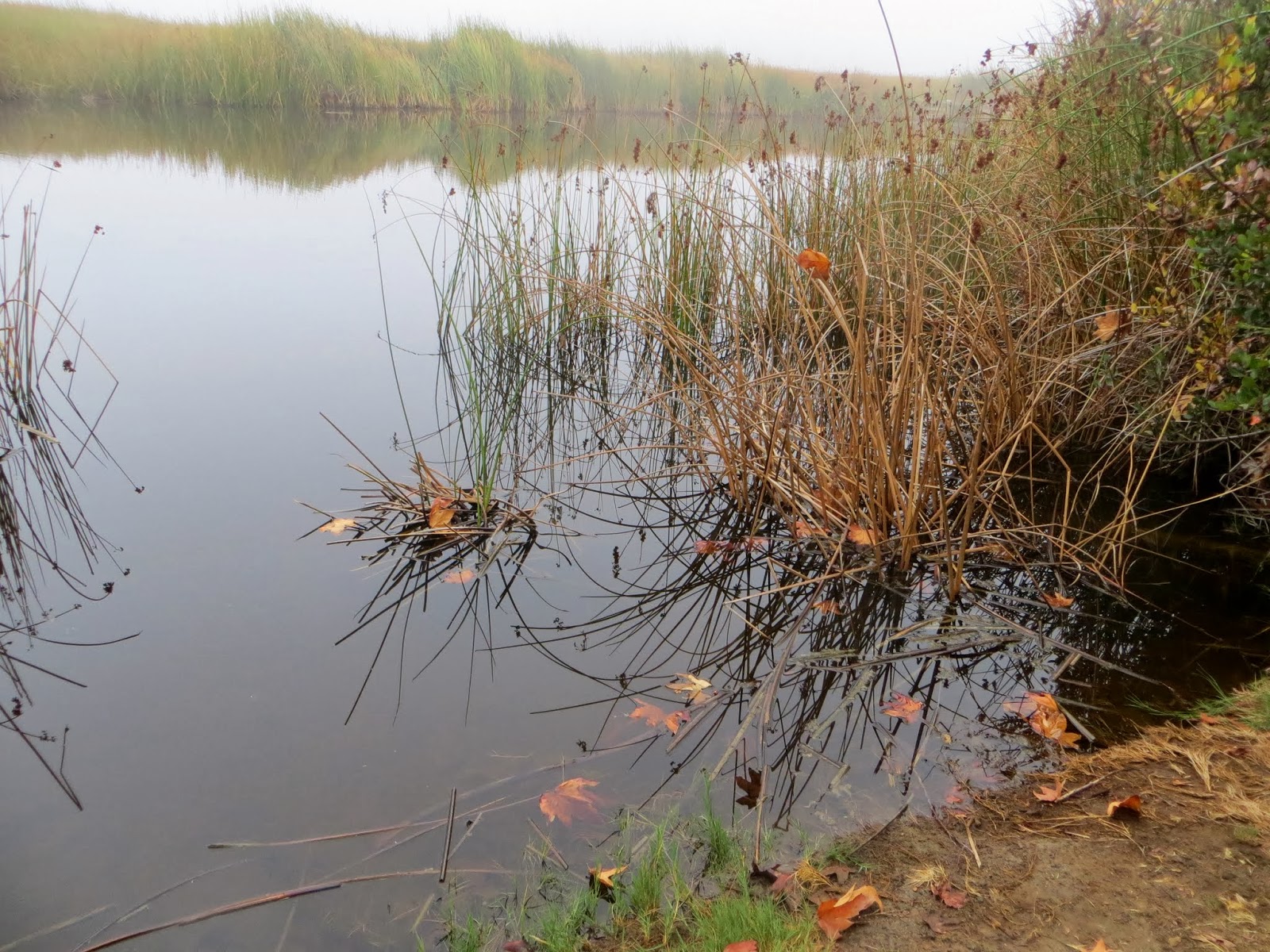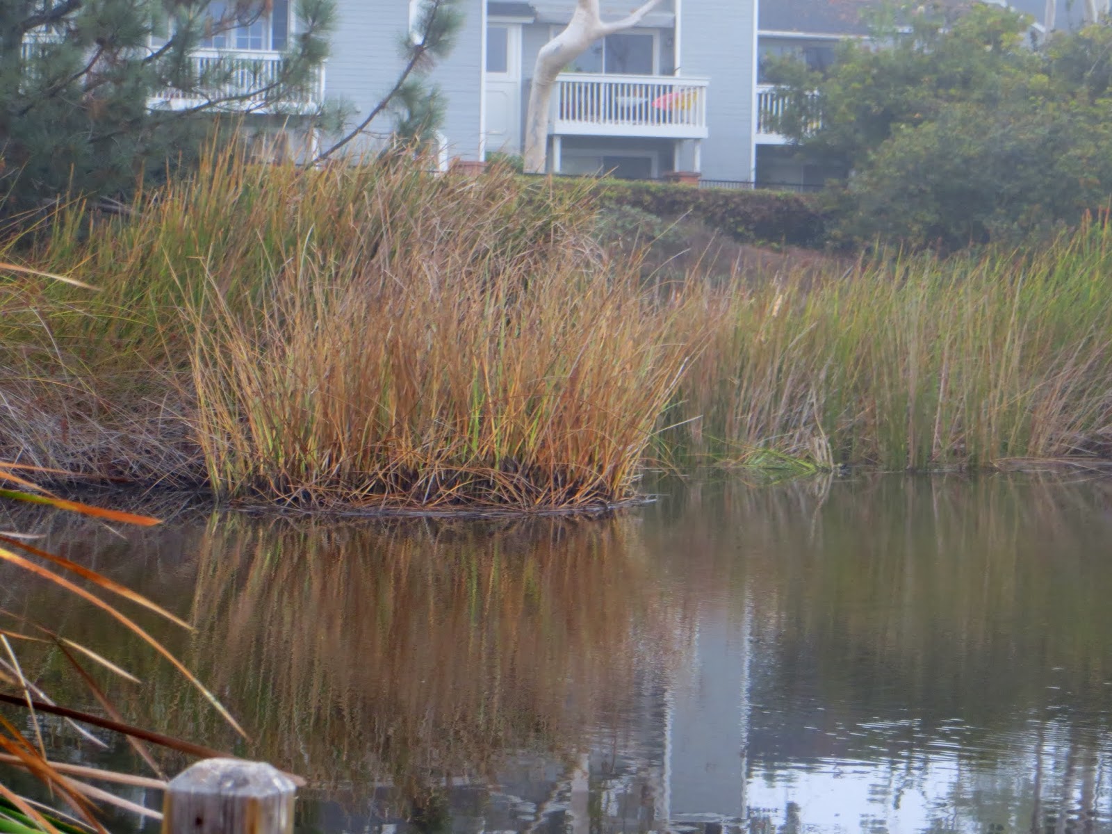 Below is another photo showing how calm and still the lagoon was. There is a very tiny white dot on the edge of the reeds toward the right. It's the great egret.