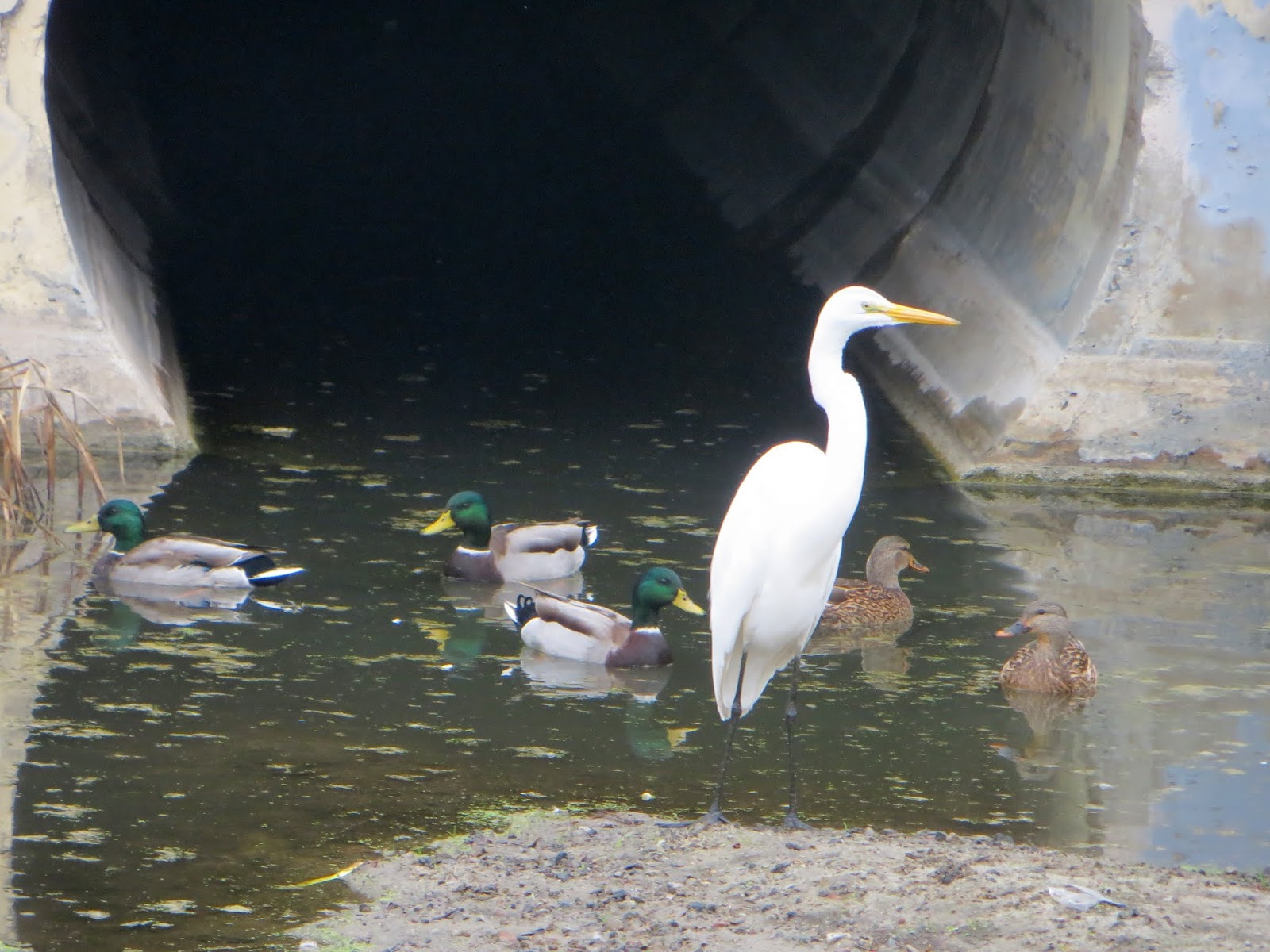 As we were driving, we saw a great egret standing in the middle of five swimming mallards. It looked kind of funny to see such a tall, white bird among them. It didn't quite fit in. Below is a photo of the egret and ducks.