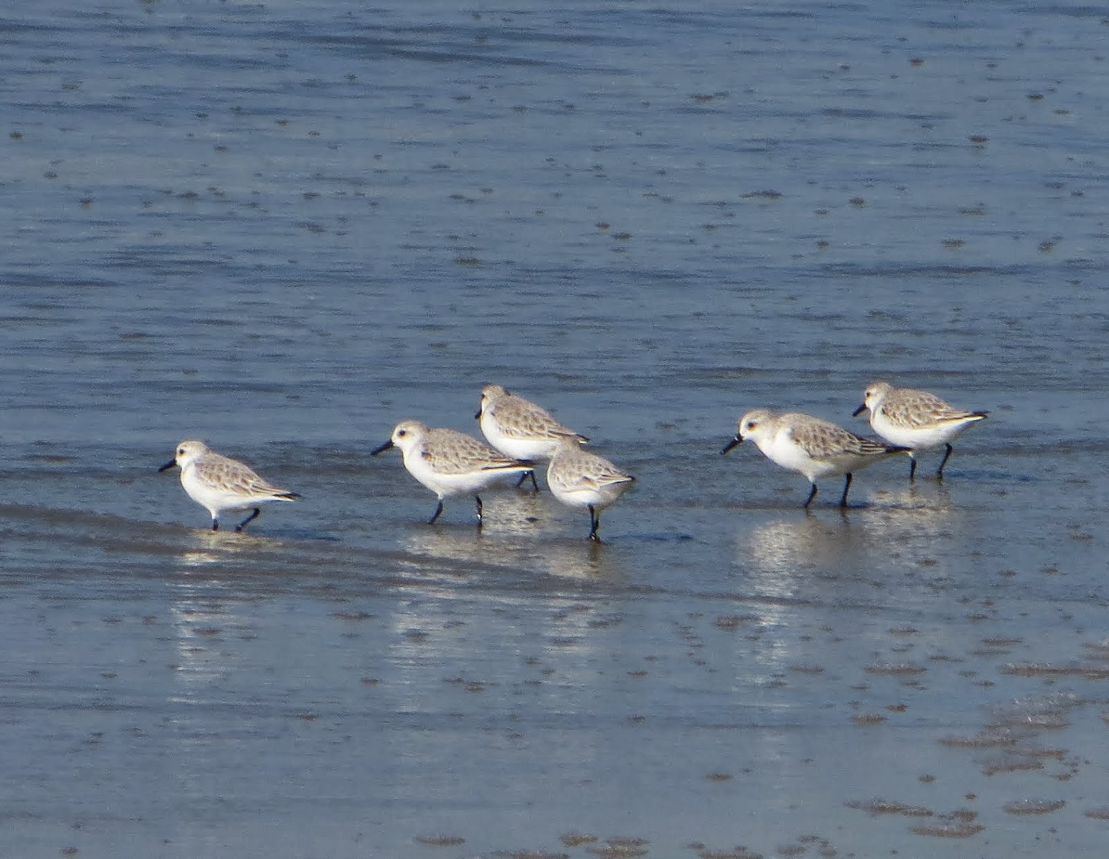 There were a few flocks of sanderlings running up to and away from the waves.  Sanderlings are found in the Arctic Circle in the summer and along the coasts of North and South America in the winter.  They are very pale with dark legs and beaks and patches on their shoulders.  In the summer they have reddish heads and chests.  Below is a group of six sanderlings.