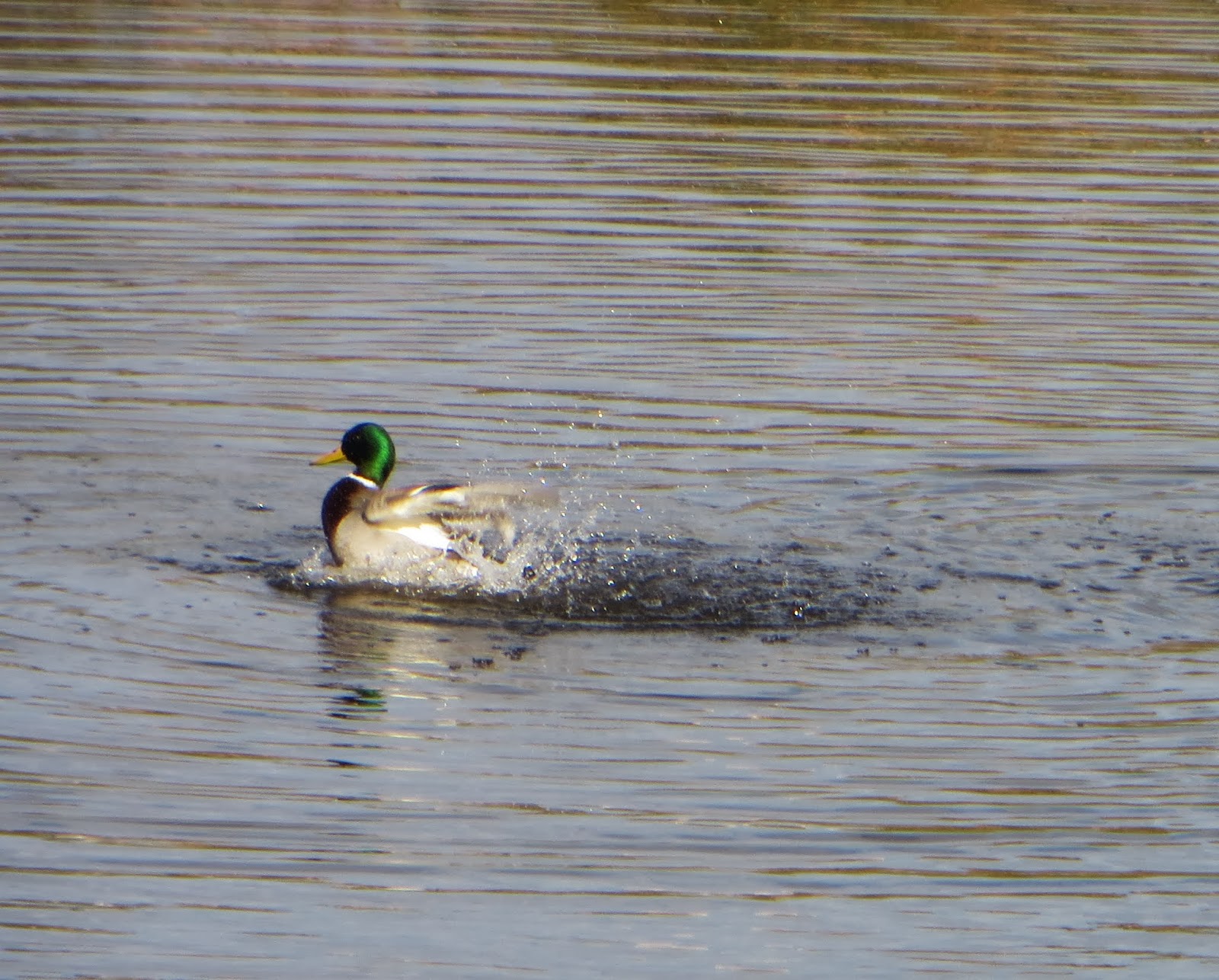 There were a few mallards swimming around taking baths.  Below is a male flapping its wings taking a bath.  The other ducks were nearby.