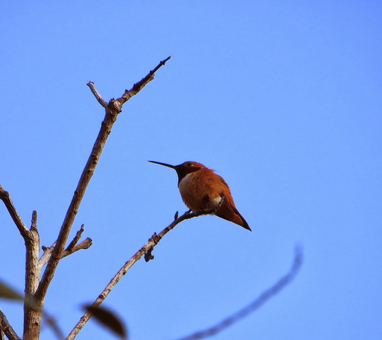 One of the first birds I saw was an Allen's hummingbird.  From the front, it almost looked like a rufous, but on its back it was green.  Below is a photo of it.  (The green back can't be seen in this photo.)