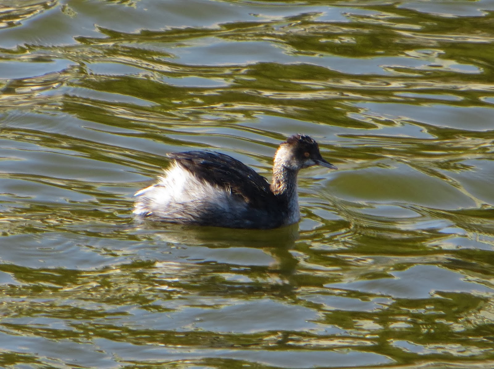 There was a little eared grebe diving and popping up again right in front of us.  It also took a little bath.  It was very fluffy and small.  Below is a photo of it.