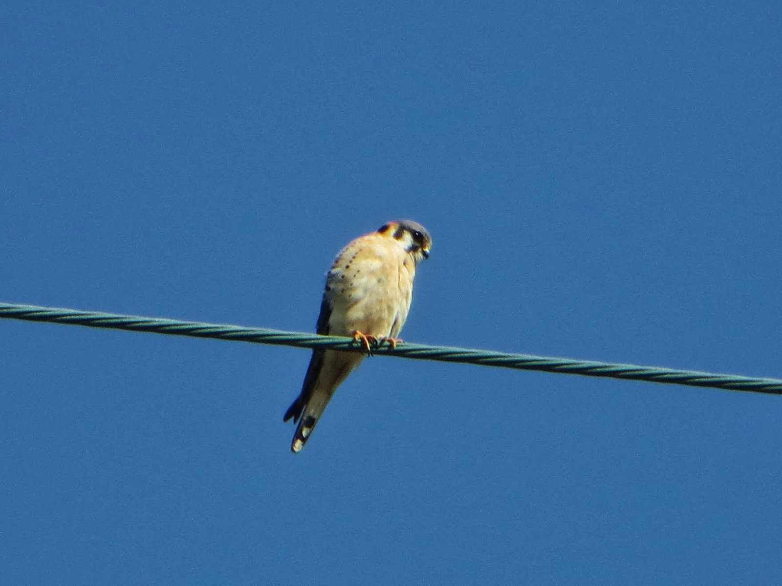 We saw an American kestrel as well as the merlin (both little falcons).  It was a male sitting on a telephone wire looking down at us.  Below is a photo of it.