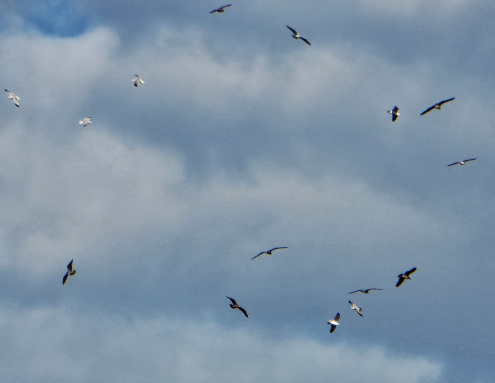 There were hundreds of seagulls everywhere.  A lot of them were ring-billed gulls.  Below is part of a large flock circling over a shopping center.