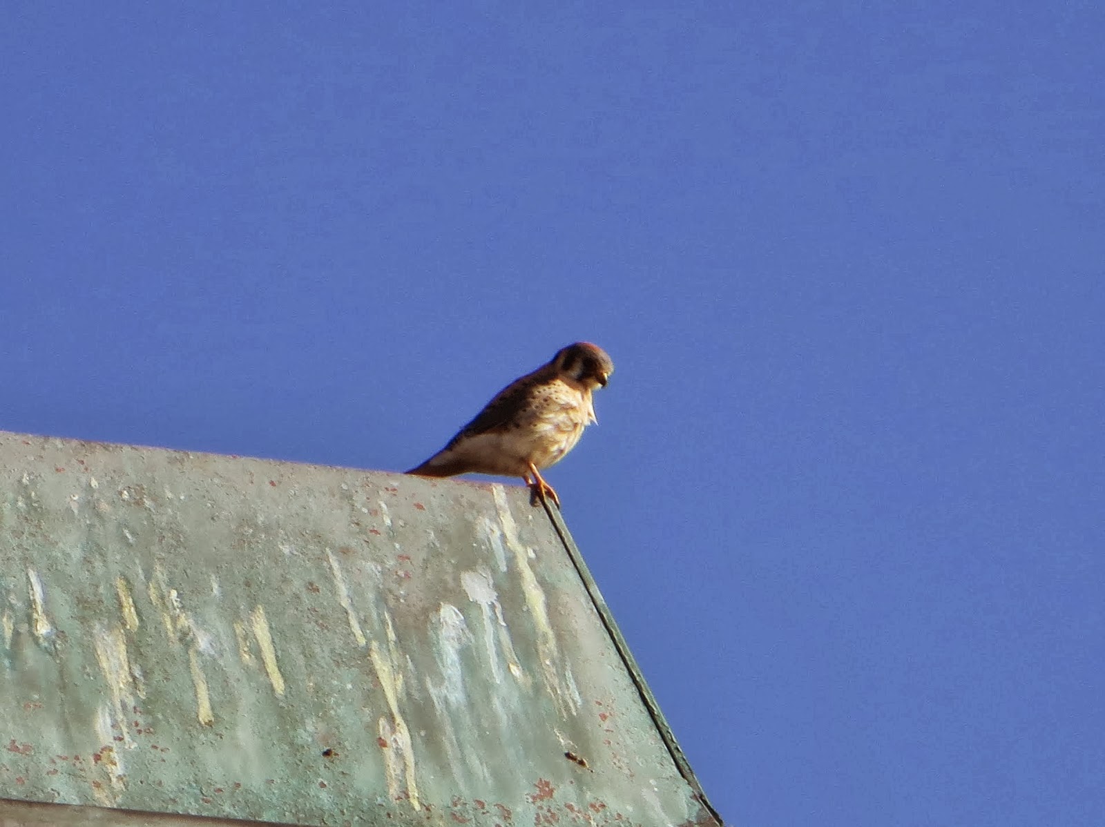 There were a couple of American kestrels around.  Below are two photos of the same male kestrel sitting on a telephone wire and a chimney.