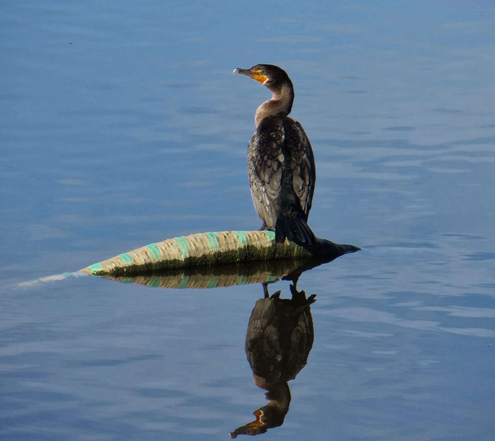 We didn't see as many double-crested cormorants as usual, but we did see a few.  Double-crested cormorants are found year-round all along the east and west coasts of the United States, including Alaska.  In the interior, they summer in the northern United States and southern Canada, and winter in the southeast down into Mexico.  They are the most common cormorant in the United States, and usually the only kind in the interior states, since most other species are pelagic.  They can usually be told apart from other cormorants by their larger size and orange face.  Below is a double-crested cormorant sitting on what seems to be a pipe sticking out of the lagoon.