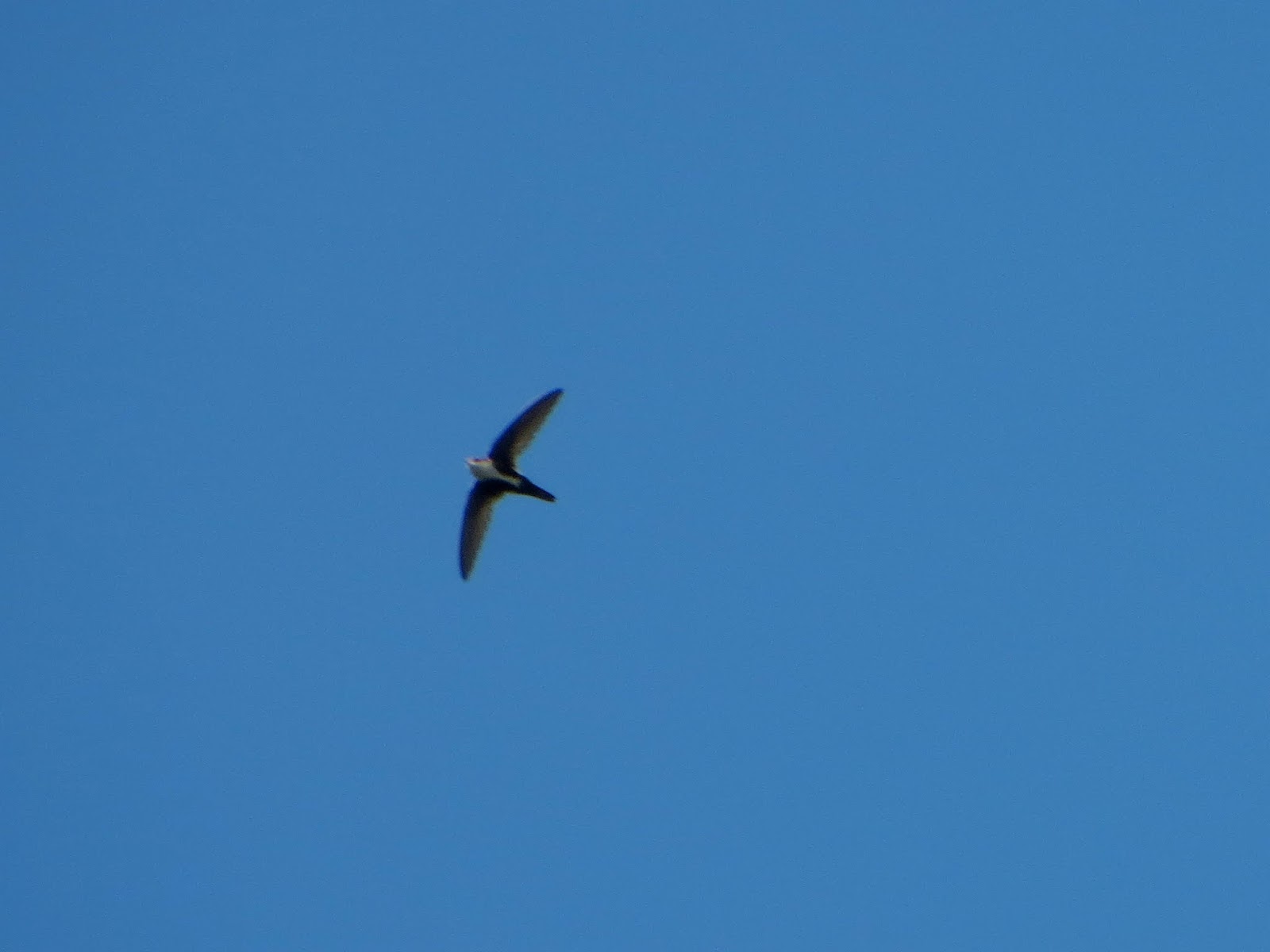 There were a surprisingly large number of white-throated swifts flying around.  Normally, we only see two or three, if any, but Saturday there was a whole flock of them flying around and around above us.  White-throated swifts summer in the western United States and winter in South America.  They are found all year round in the southwest and Mexico.  They have white sides and throats and the rest is black.  Swifts are similar in appearance to swallows, but are, in fact, more closely related to hummingbirds.  They can be told apart from swallows by their scythe-shaped wings and stiffer movements.  Below is one of the swifts.