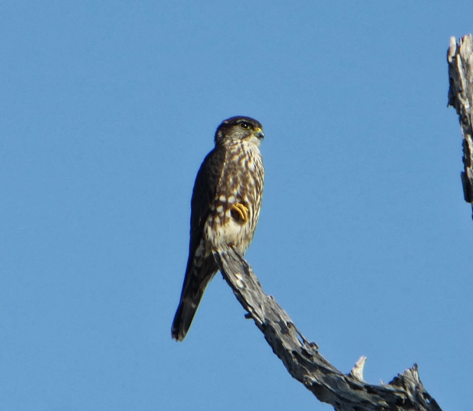 An exciting sight was a merlin.  It was sitting on a dead tree beside the road.  We stopped so I could take a photo, and it turned out to be a very good view.  Below is a photo of it.  It had its leg tucked up.