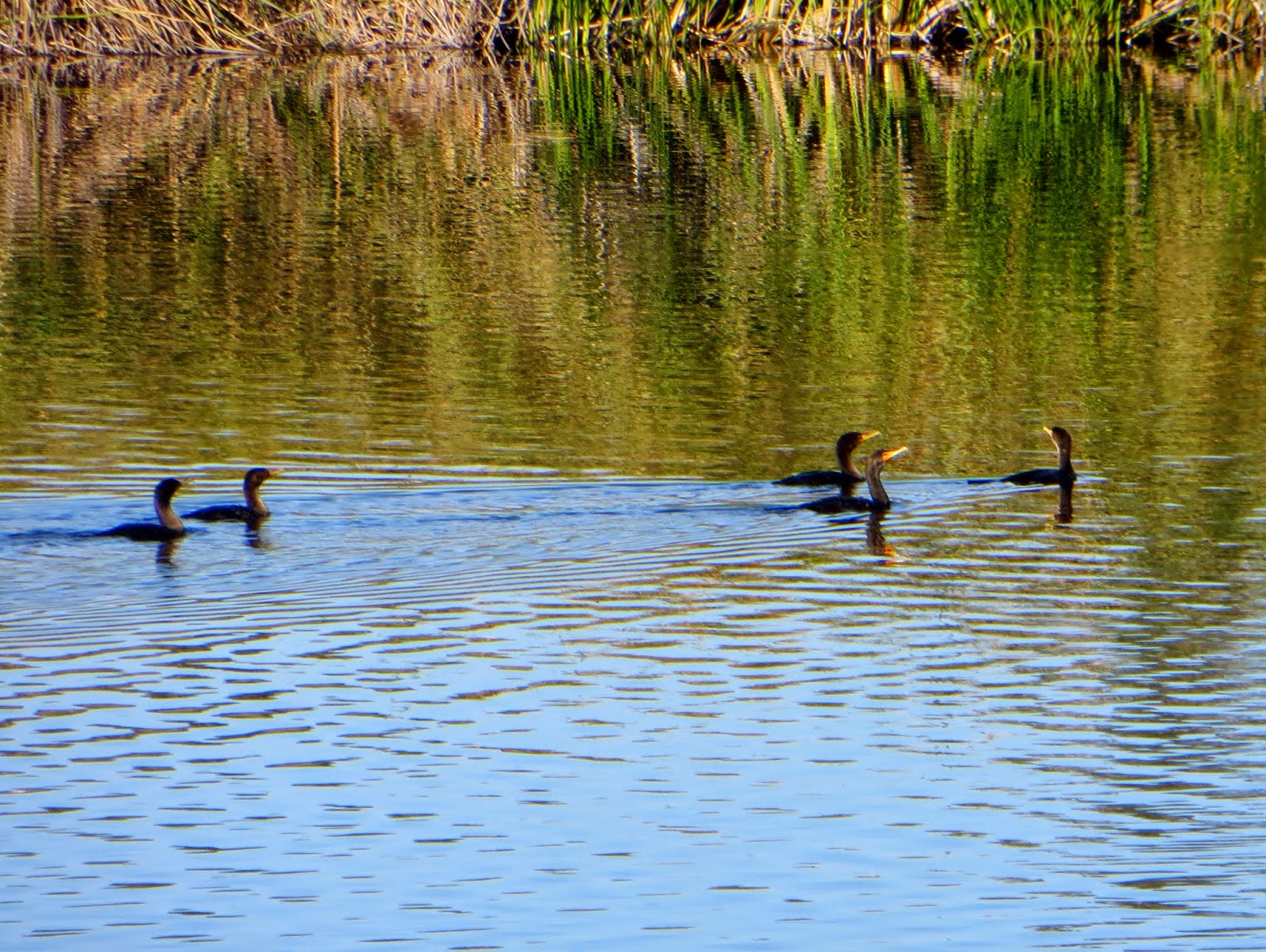 There seemed to be more Western Grebes and Double-Crested Cormorants than usual.  There were large groups of them around.  The Double-Crested Cormorants seem to like swimming together in a V shape (no matter how many of them there are) and sometimes they all dive into the water at the same time.  Below are three photos.  The first is a Western Grebe and the second two are Double-Crested Cormorants swimming in V's.
