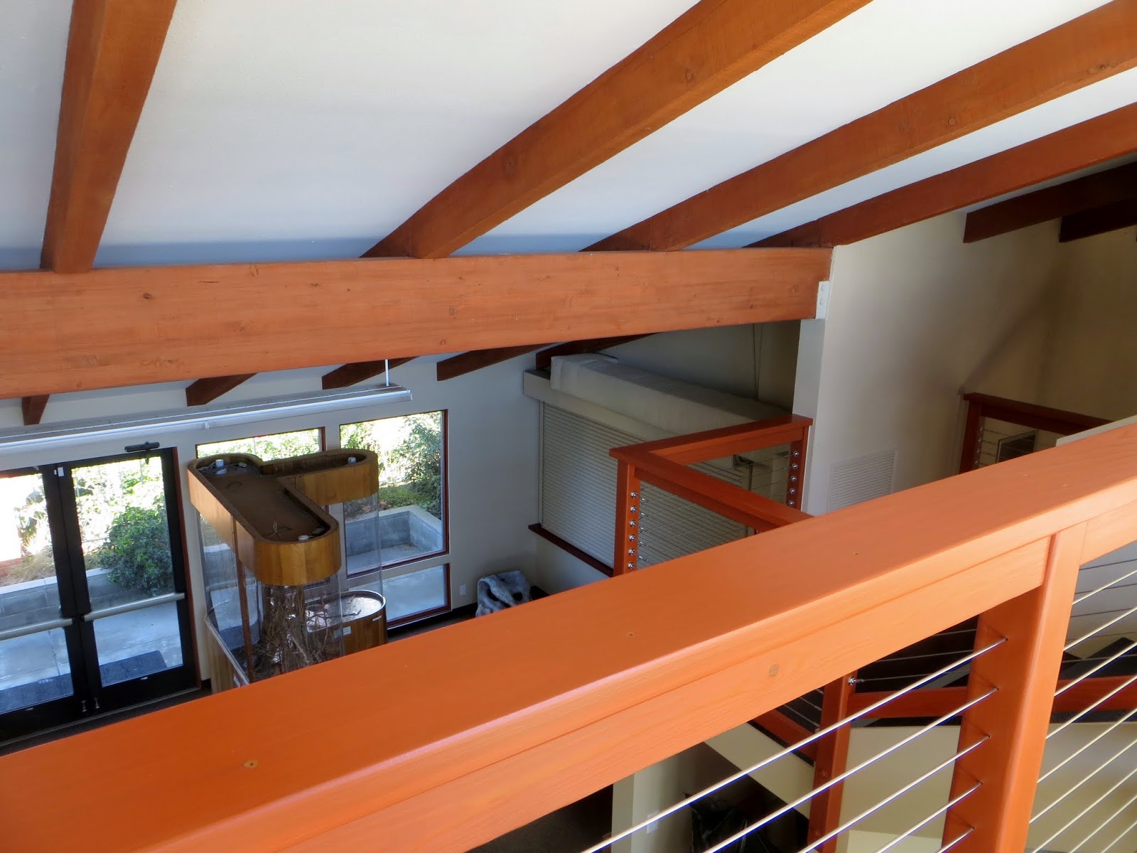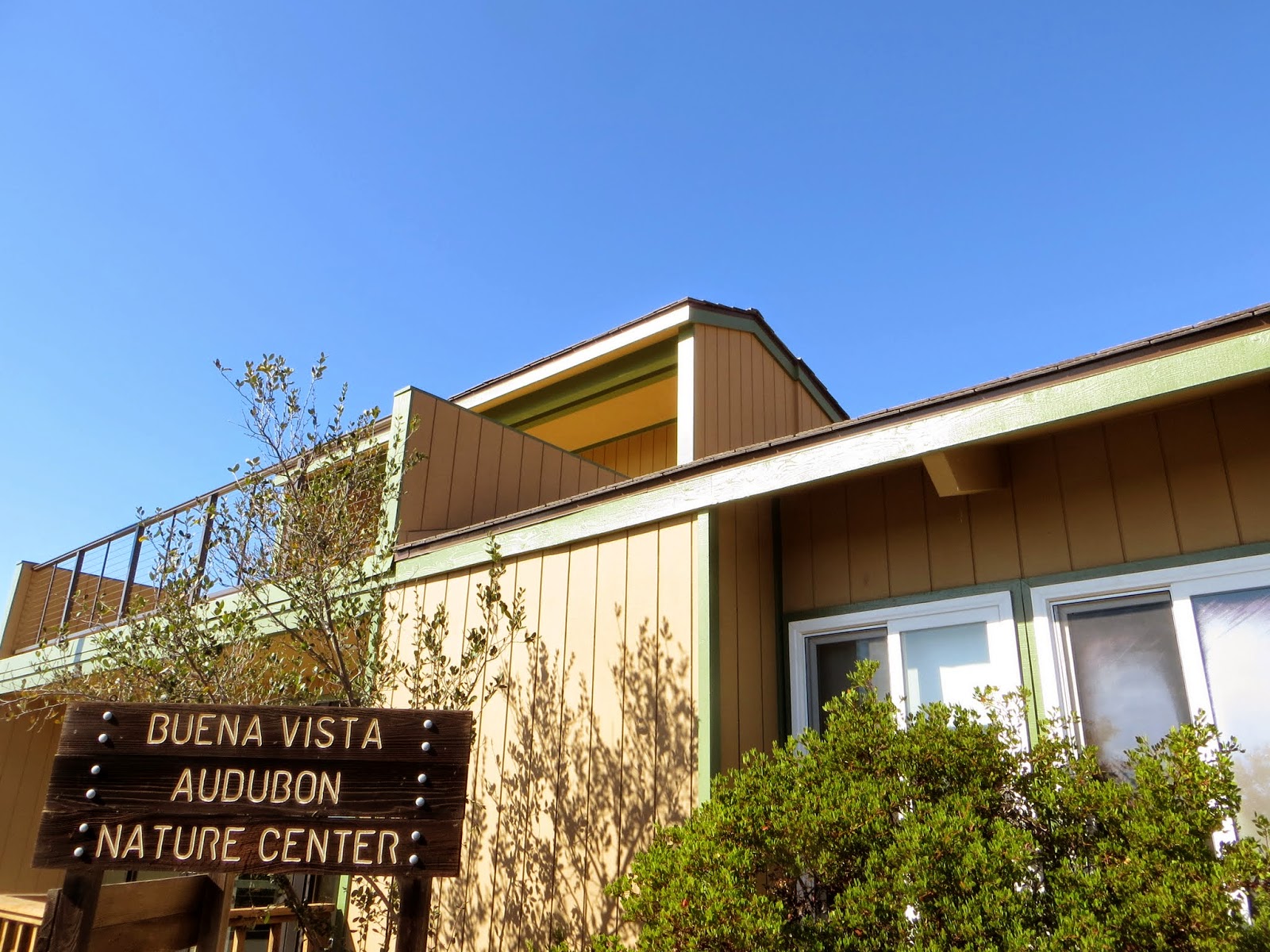 Although it isn't quite finished, the nature center has been remodeled.  It now has an observation deck.  There are stairs and (soon) an elevator.  The view is beautiful, and we can now see some parts of the lagoon we hadn't been able to see from ground level.  Although the center isn't open to the public quite yet, our group was able to go up on the deck.  Here's a sneak peek of it.  Below are photos of the view from the deck, the deck itself, the new staircase, and the nature center from the outside.