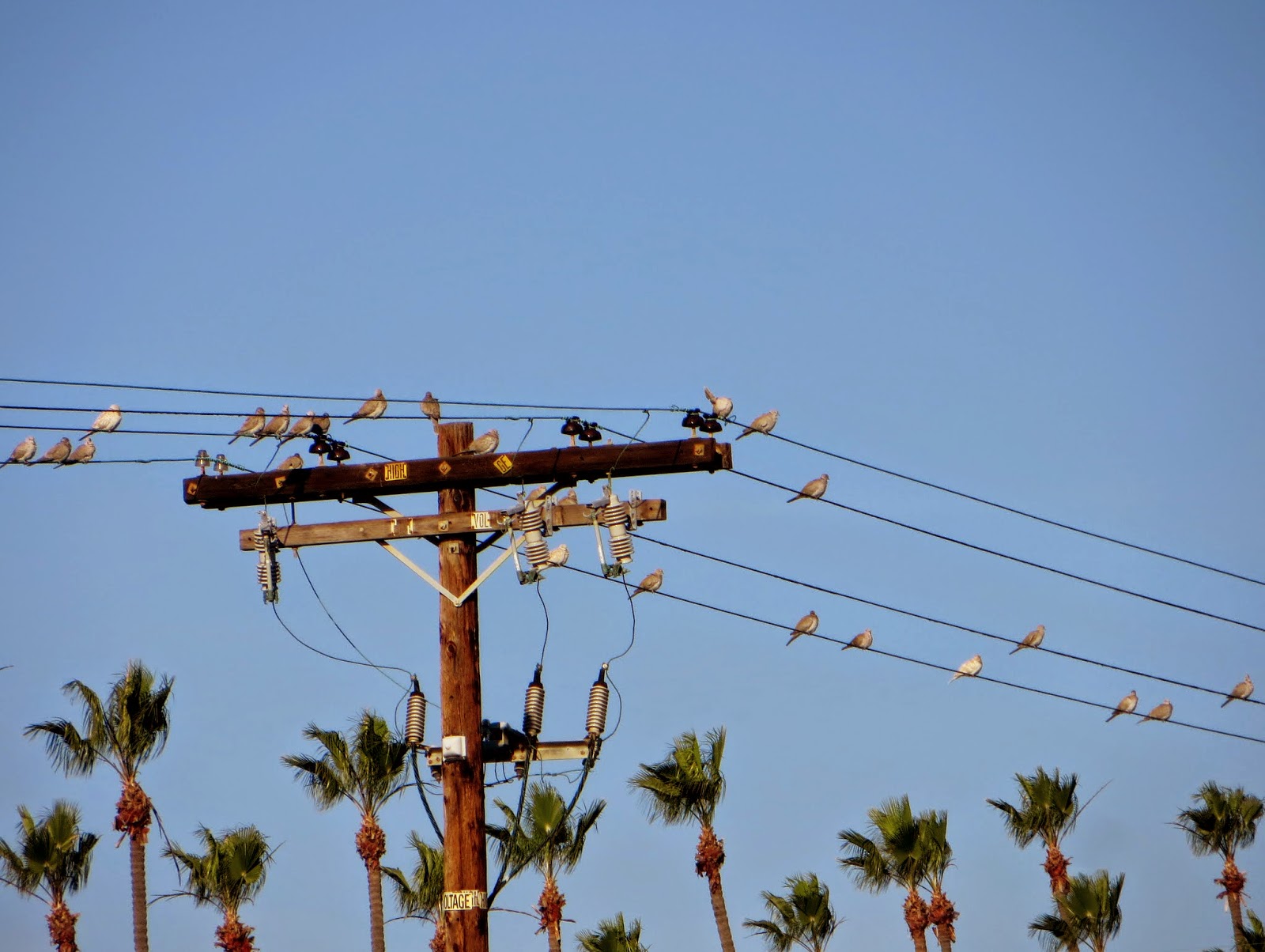 There were more Eurasian Collared-Doves on Saturday than I've ever seen at the lagoon before.  There were around thirty of them near the nature center.  We usually only see a few of them.  Below is a photo of the doves sitting on a telephone pole and telephone lines.  Although a few of them appear much paler than the others, they're all Eurasian Collared-Doves.
